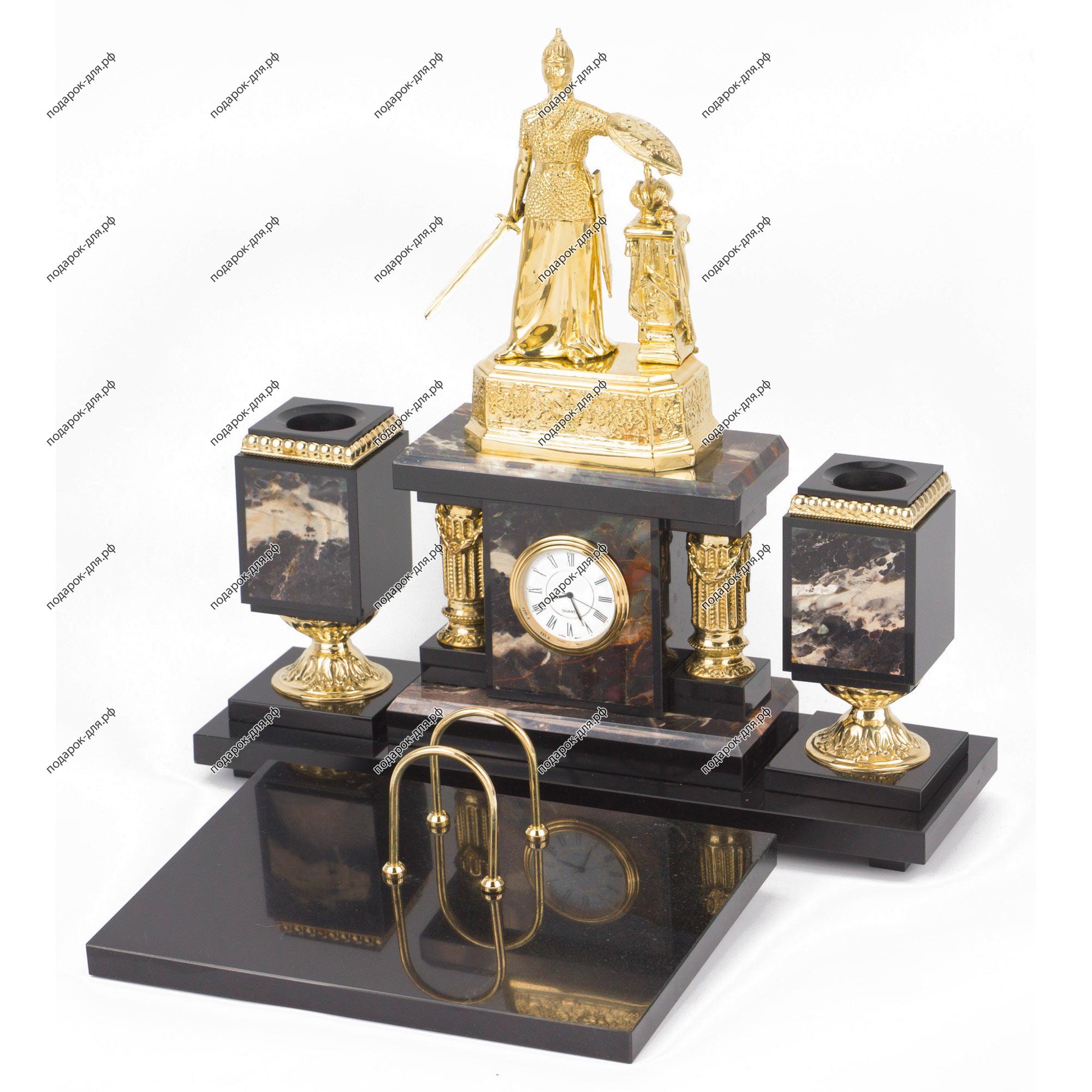 Настольный набор из яшмы и долерита с бронзовым литьем. Размер: часы 340х110х340 мм, подставка под календарь 240х180х25 мм