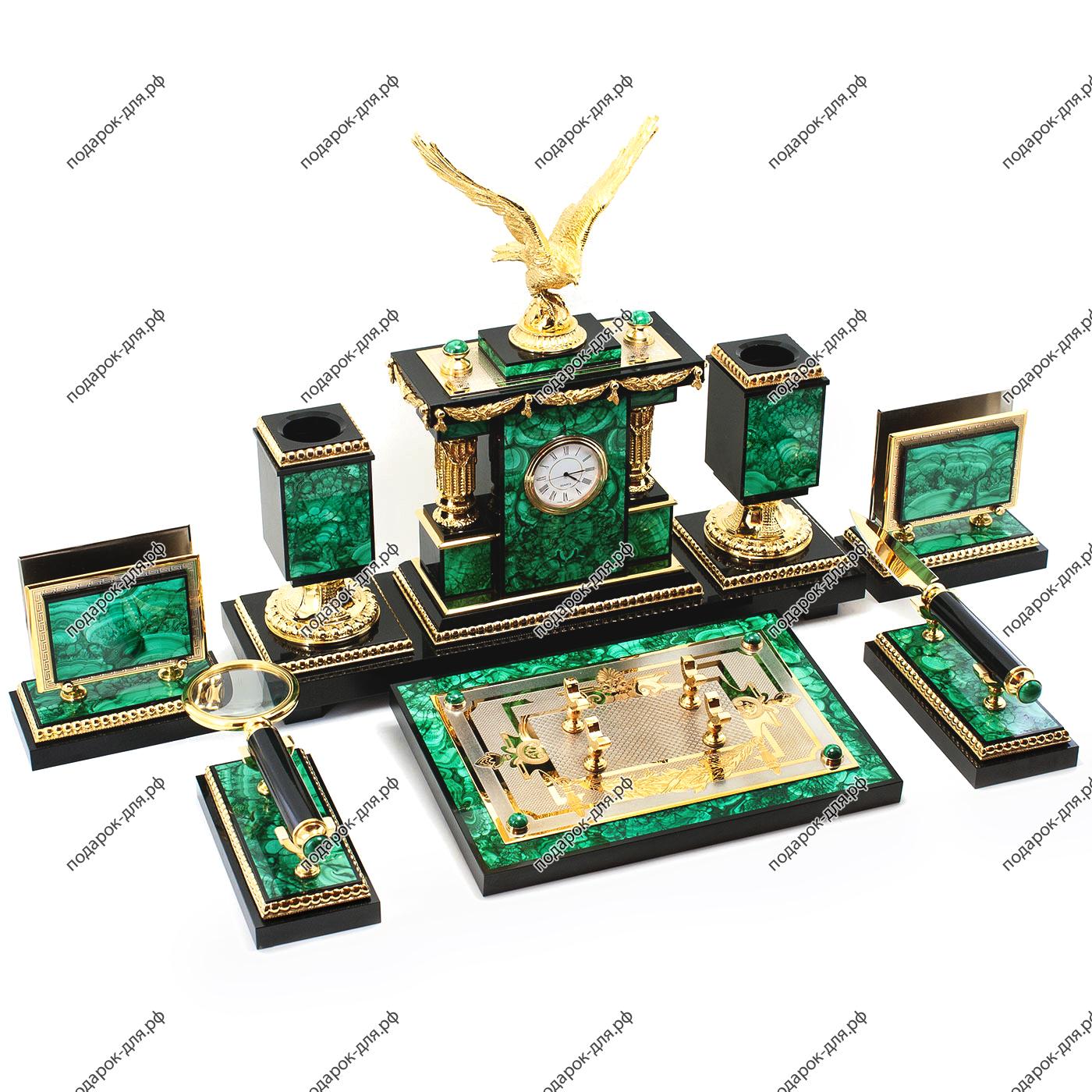 камень малахит, долерит, бронза, никель, золото (999,9).